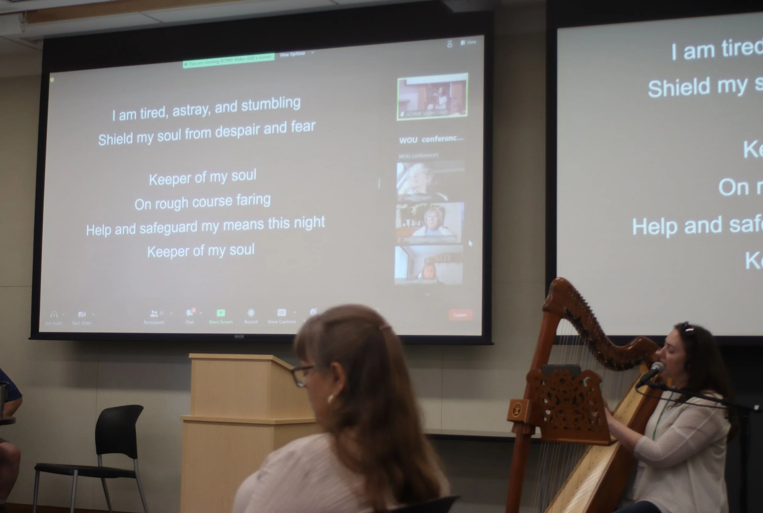 Bethany Lee playing the harp during meeting for worship